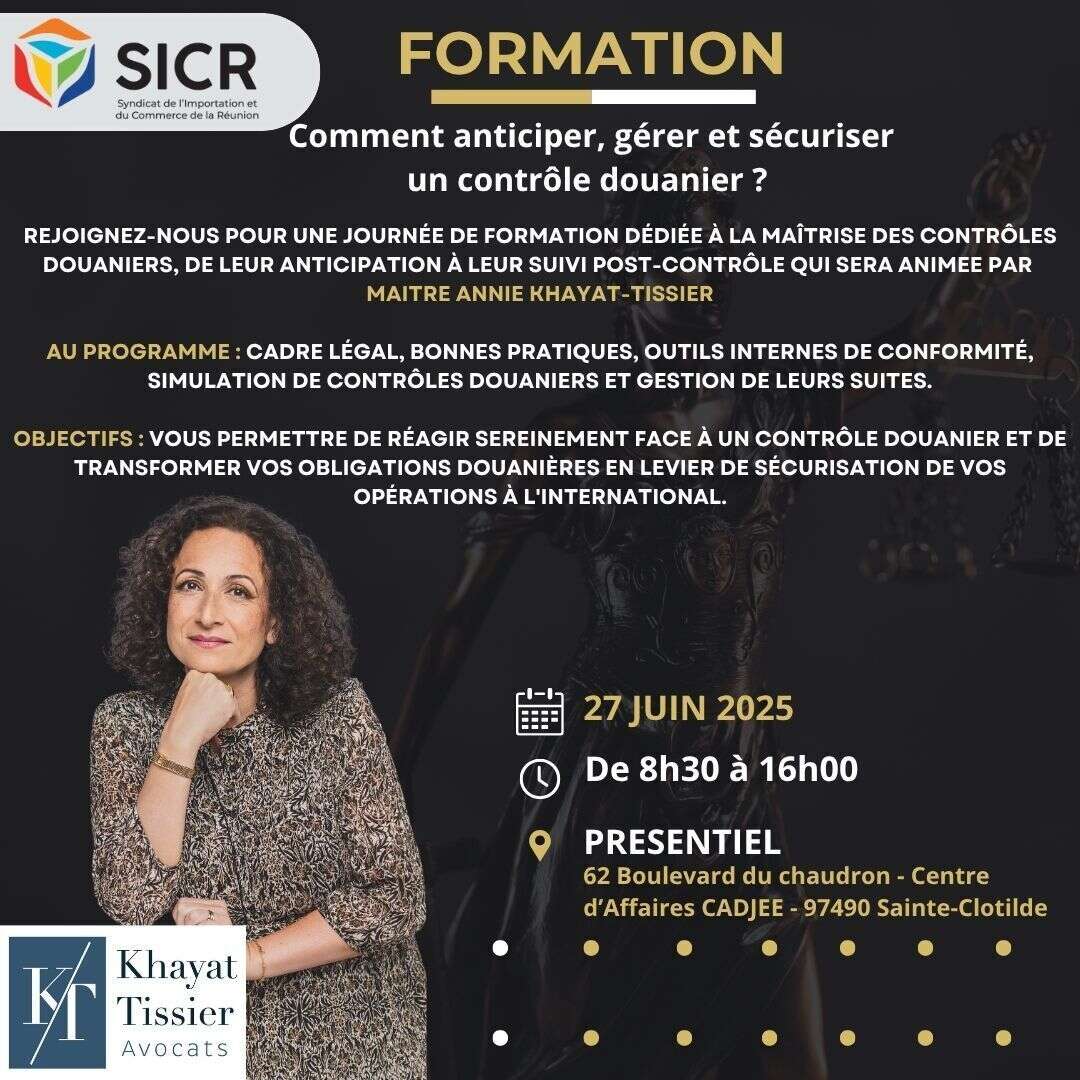 Le 27 juin 2025, à la demande du SICR, Maître Annie Khayat-Tissier a animé une journée de formation consacrée à l’anticipation, la gestion et la sécurisation des contrôles douaniers.